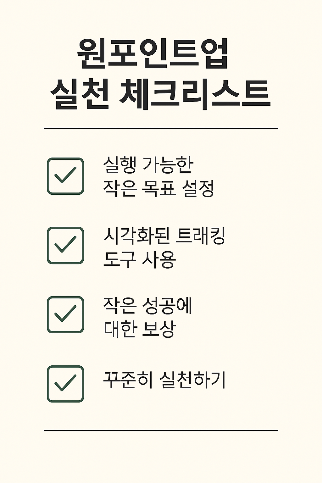 원포인트업 전략의 핵심은 “오직 하나의 행동 변화에만 집중하라”는 원칙입니다. 예를 들어 아침 6시에 일어나기, 하루 10분 독서하기, 매일 물 2리터 마시기 같은 구체적이고 단순한 행동 하나를 설정합니다. 그 하나만큼은 ‘절대 빠뜨리지 않고 지속한다’는 자세로 임하는 것이죠. 이렇게 작고 명확한 목표는 심리적 부담을 줄여주고 실천력을 높여줍니다. 여러 목표를 동시에 추구하면 시작은 의욕적이지만, 지속은 어렵습니다. 반면 원포인트업은 하나의 습관에 집중하기 때문에 습관 형성과 유지에 매우 유리합니다. 이는 ‘의지력’이 아닌 ‘시스템’에 기반한 전략으로, 변화가 점진적이지만 꾸준하기 때문에 장기적으로 큰 성과를 이끌어낼 수 있습니다. 예를 들어 ‘아침에 일어나서 5분간 스트레칭하기’를 원포인트업 목표로 삼았다면, 30일 동안 그 하나만 실천합니다. 이 간단한 습관 하나만으로도 생활 리듬이 안정되고 에너지 수준이 달라지는 효과를 체감할 수 있습니다. 그리고 습관이 자리 잡으면 다음 목표로 넘어가는 방식입니다. 마치 게임처럼 하나하나 레벨 업해가는 방식이라 지속동기 유발에도 탁월하죠. 원포인트업을 성공적으로 실천하기 위한 팁도 있습니다. 첫째, 실현 가능한 작은 목표를 선택하세요. 너무 큰 목표는 오히려 작심삼일이 될 수 있습니다. 둘째, 시각화된 트래킹 도구를 사용하세요. 예: 캘린더에 스티커 붙이기, 습관 앱 활용 등. 셋째, 성공한 날은 스스로 칭찬하거나 소소한 보상을 주세요. 긍정 피드백은 행동 지속의 원동력이 됩니다.